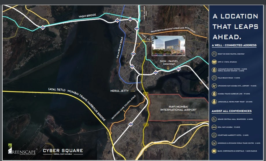 Greenscape Cyber Square is the perfect address for your business in the most coveted commercial landmark, Nerul. It offers finely designed office spaces and commercial shops ranging from 900 sq. ft. to 2500 sq. ft. The 26-story elevation comprises 300 commercial units with 10 units per floor and 2-level basement parking spaces. The 9 high-speed elevators, including 2 service lifts, enable smooth functionality within this commercial space. It is situated beside the Mumbai Pune Expressway and Sion Panvel Highway, offering wider connectivity to vital localities of Mumbai, Navi Mumbai, and Pune. Renowned educational institutions and hospitals such as DY Patil University, SIES, DY Patil Hospital, etc. are within reach. It is just 4 Km from Navi Mumbai International Airport. Its proximity to Juinagar railway station and highways will make commuting reliable for daily travellers. Thus, grow your business in the most anticipated location of Navi Mumbai, which offers seamless connectivity and sound infrastructure.